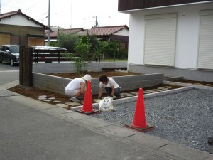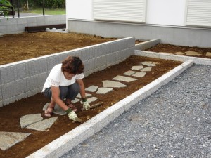 梅雨明けの晴天の中、F様自ら敷石をひとつひとつ並べてアプローチづくりです。