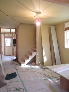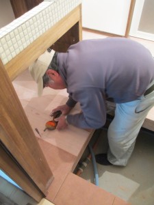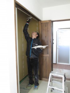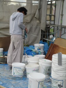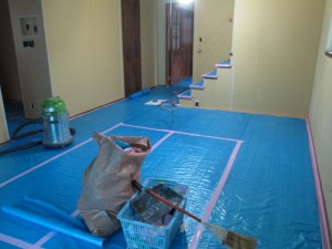 真っ青に養生シートで床を保護して、次に何がはじまるかといえば・・・。