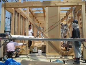 外壁は、断熱材を取り付けた状態のパネルで組んでいきます。