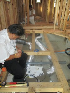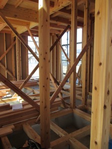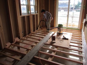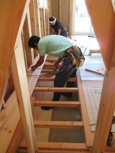 床を張り終えた大工さんは、今度は天井の下地づくりです。斜めの天井をつくるために大工さんも