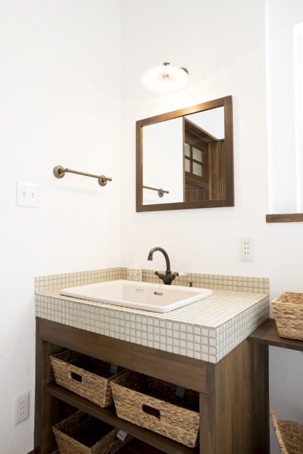洗面台周辺に鏡・照明・タオル掛け・コンセント・電気のスイッチ・収納棚など、必要なものを全て取り付けたつくり。ちなみに、タオル掛けや照明、水廻りに貼るタイルの色やデザインも選べます。
