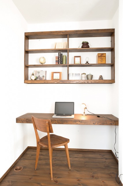 デッドスペースのないつくり。デスクの上部には収納棚を取り付け、スペースを有効活用しています。床の色や模様との相性も抜群です。