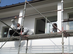バルコニーではスタッフが格子を取り付ける作業をしています。