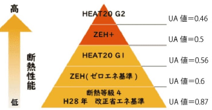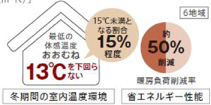 H28 年に国が定めた6 地域の基準(ZEH) は0.6(w/m2k) を大きく上回り、北海道の住宅レベルの断熱性能を標準装備しています。