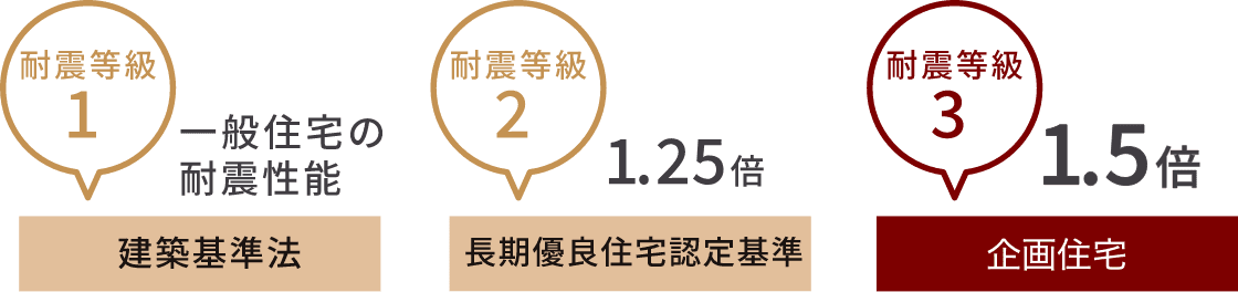 企画住宅は、木造住宅の最高耐震等級である耐震等級3(許容応力度計算)を標準装備しています。これは、震度6 強~ 7 の大地震が起きても軽い補修程度で住み続けられるレベルです。消防署や警察署など防災拠点である建物と同じ耐震性能です。