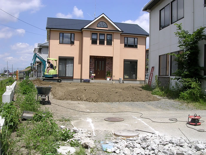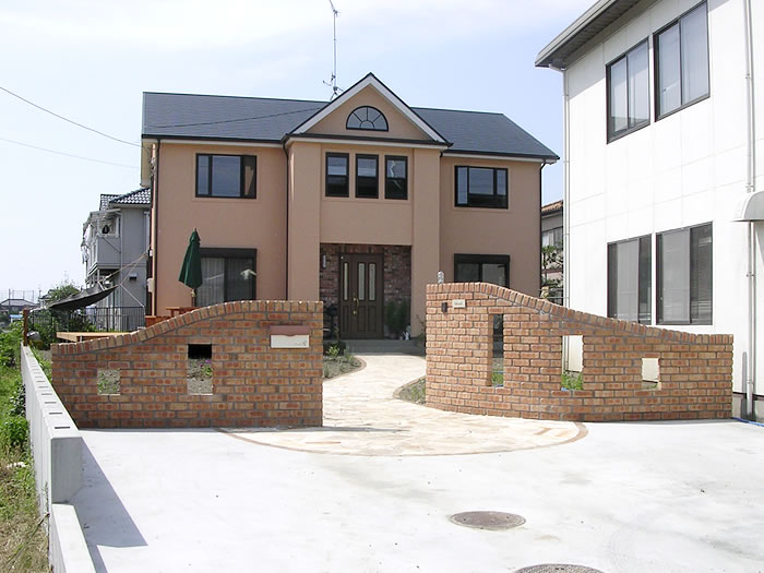 アプローチ・門・駐車場を作りたいということで、何度もお打ち合わせをさせていただきました。お施主様のご希望で、アプローチは石貼り、門はレンガ積みでとのことでした。