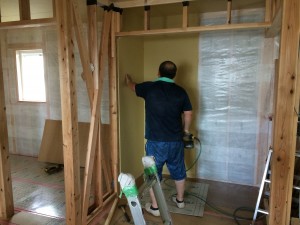 只今、壁の石膏ボードを施工中です。