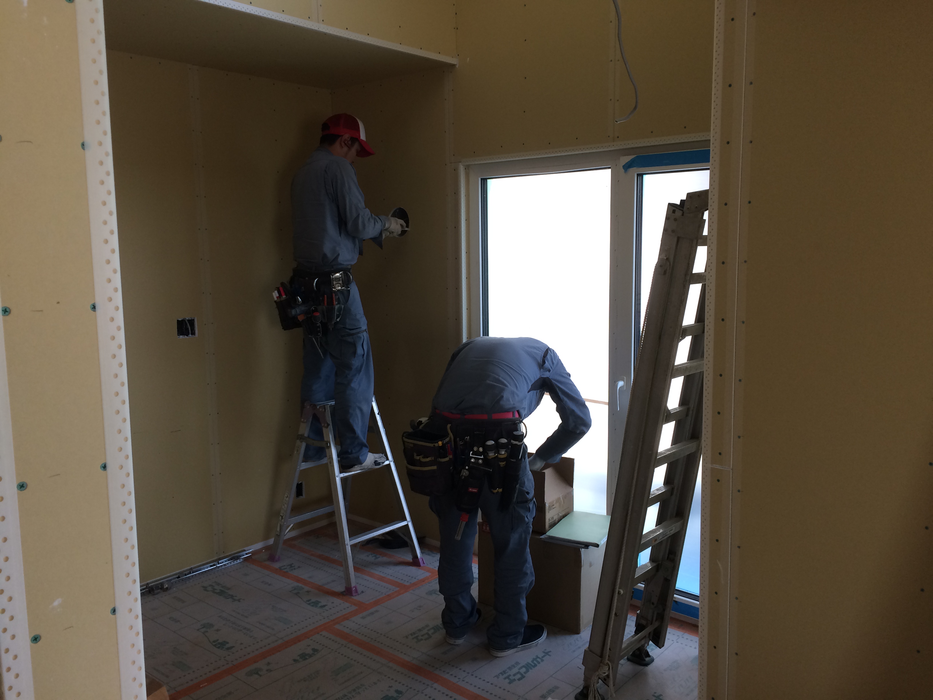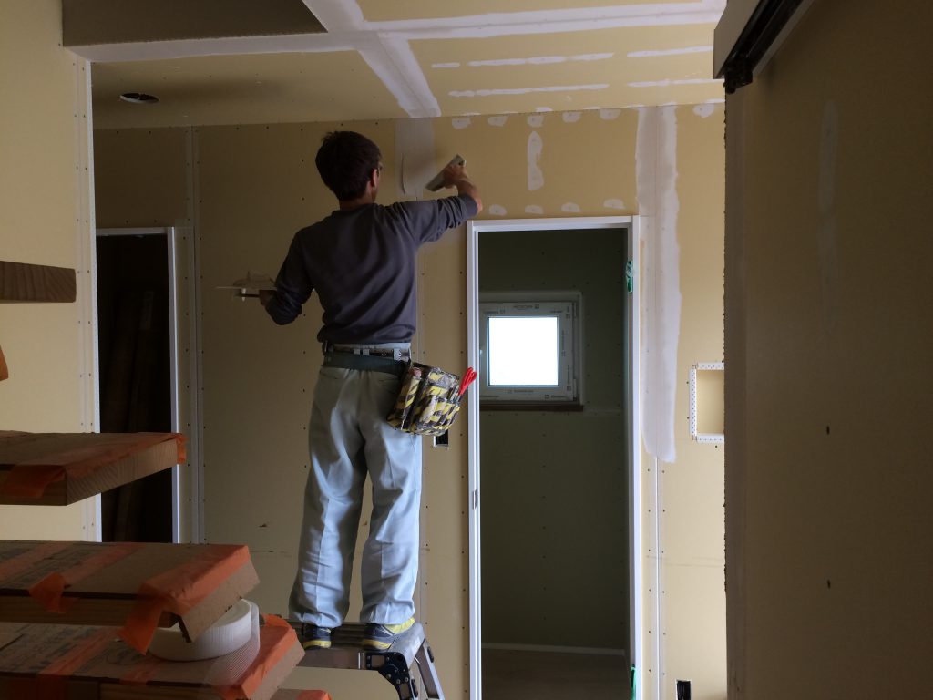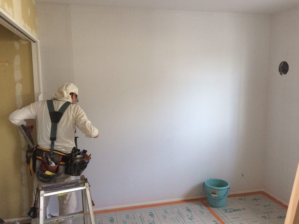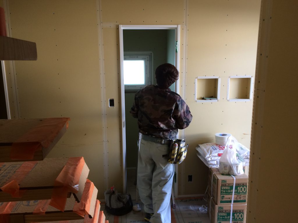 只今、ボード継ぎ目部分にテープ貼りを行っております。
