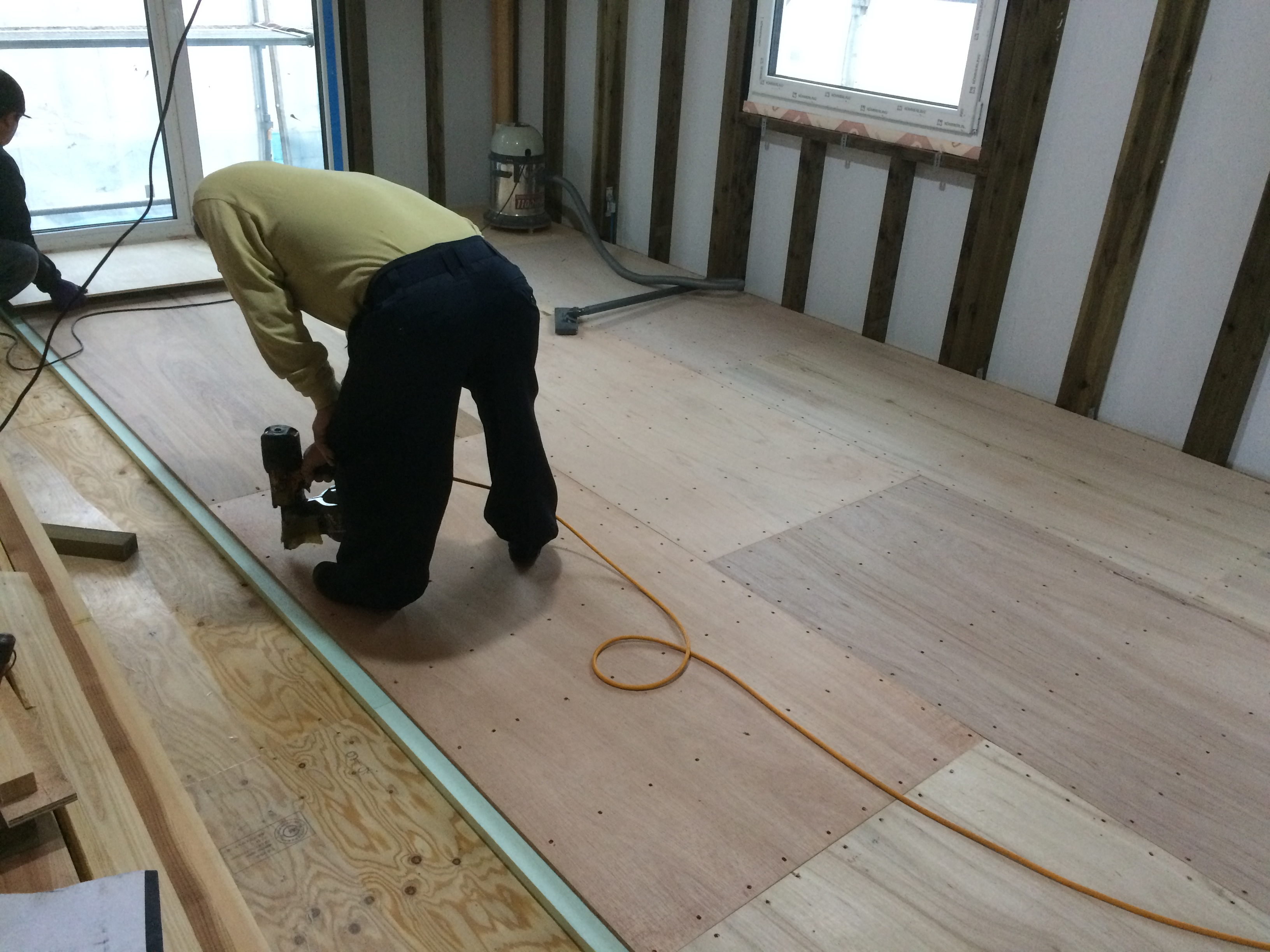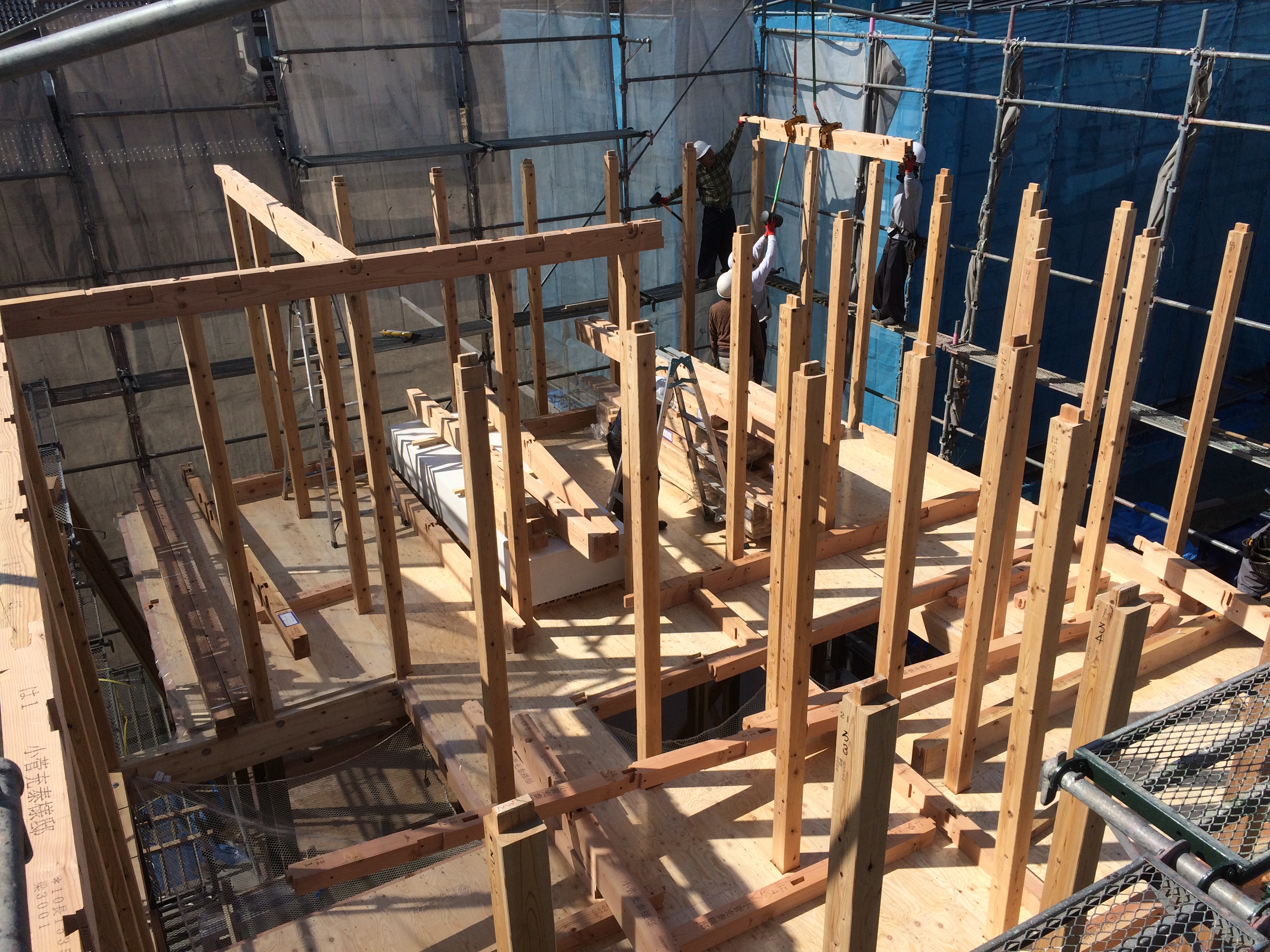 はい!1階の梁組も完了し、床合板、2階の柱建てと順調に進んでおります!