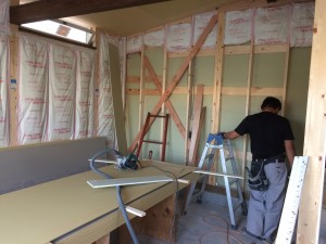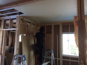 只今、壁の石膏ボードを施工中。