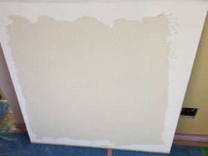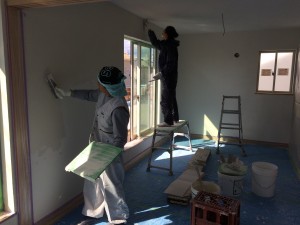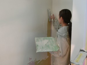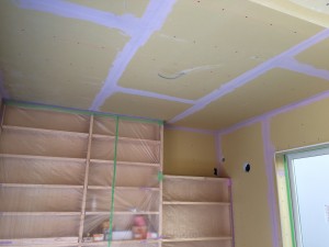 石膏ボードの継ぎ目部分にパテ処理をしていきます。