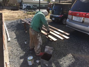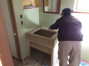 造作洗面台の所にモザイクタイルを貼っていきます。