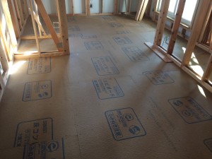 只今、2階床に遮音ボードを施工中。