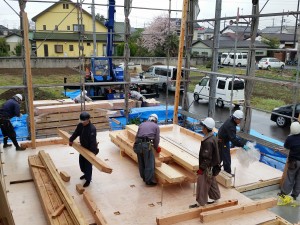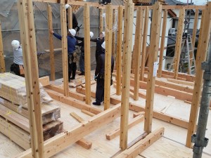 お昼休憩をはさみ、小屋組みを行っております。
