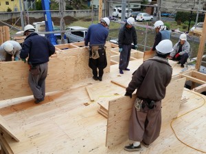 只今、2階の床合板を施工しています。