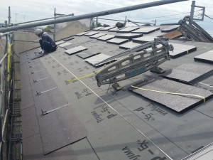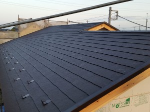 ルーフィング貼りも完了し、屋根葺きを行っております。