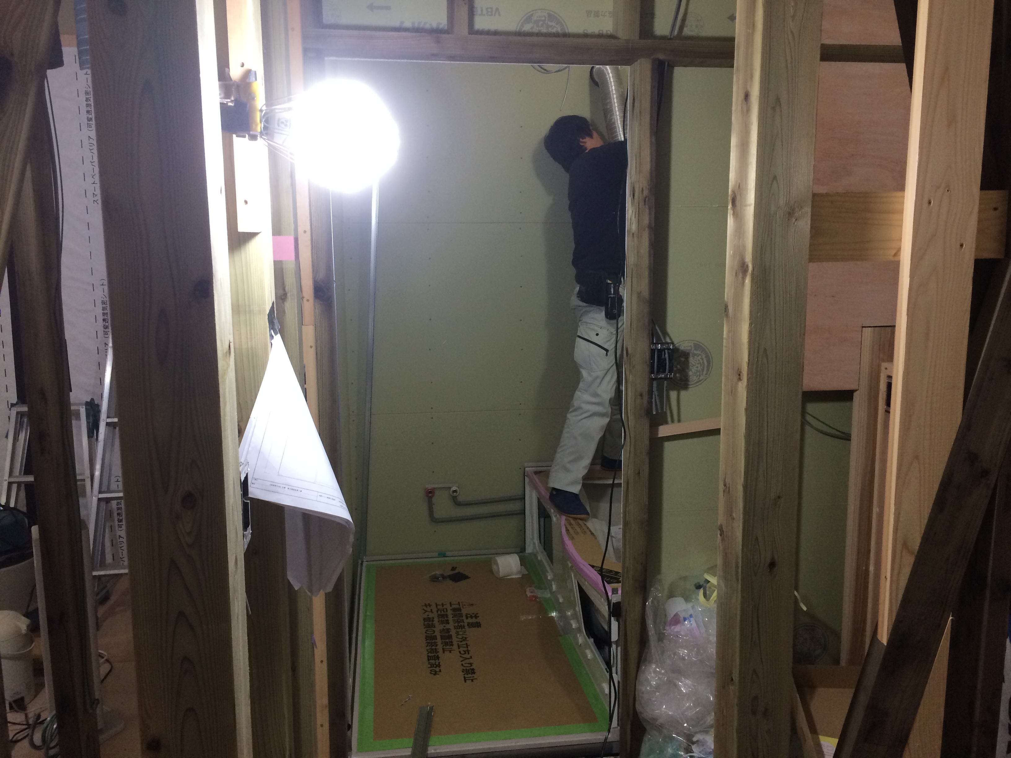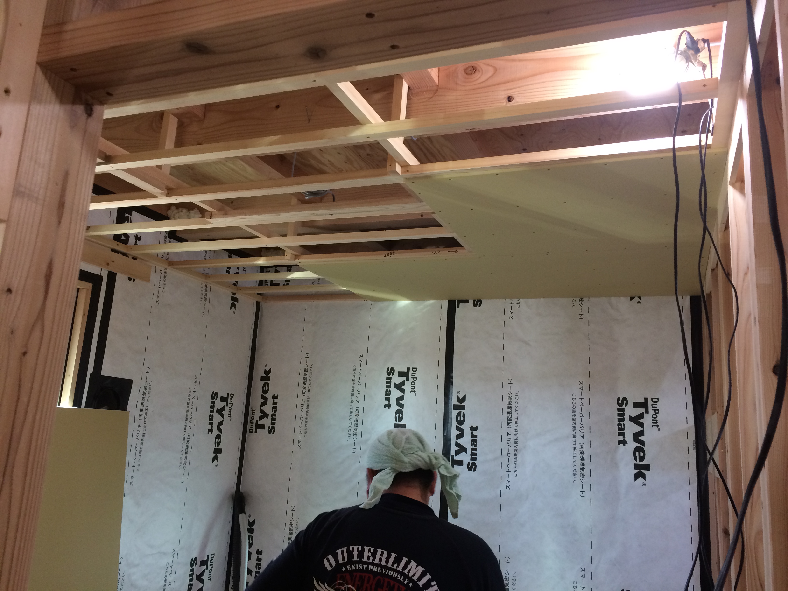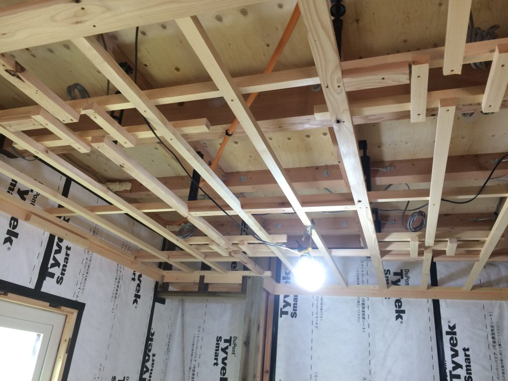 1階は2階からの衝撃音低減の為、防震吊り木を使用しています。