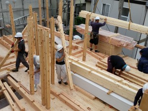 1階の柱・梁も組み終り、2階の柱を建てています。