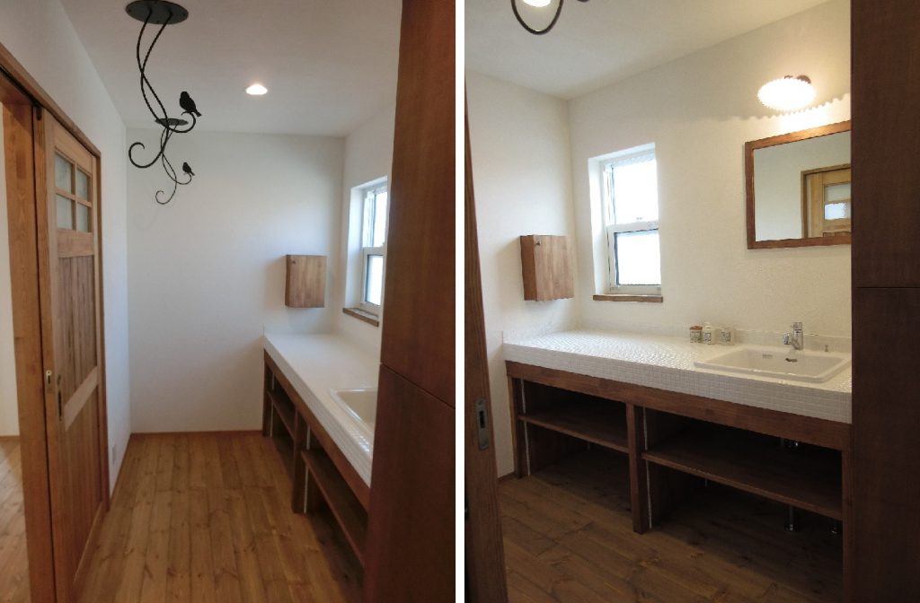 ハンドメイドのアイアン室内物干しは、鳥の装飾を付けて。2Fの水廻り、白いタイルを貼り上げた広い造作洗面台。