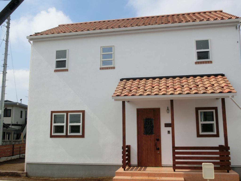 窓の木枠、窓下のタイル、南欧風の瓦などおしゃれな外観。