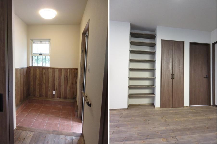 玄関ホールには杉の腰板を貼り上げて木のぬくもりが良いですね。