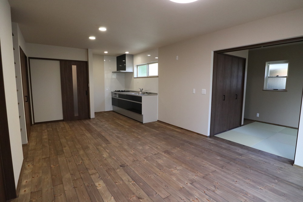 I型キッチン、隣接した和室もある広々リビングダイニング。