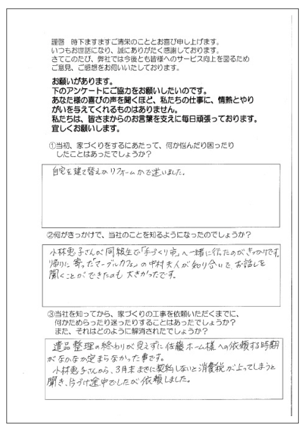 遺品整理の終わりが見えずに、佐藤ホーム様への依頼する時期がなかなか定まらなかった事です。小林恵子さんから、3月までに契約しないと消費税が上がってしまうと聞き、片付け途中でしたが依頼しました。