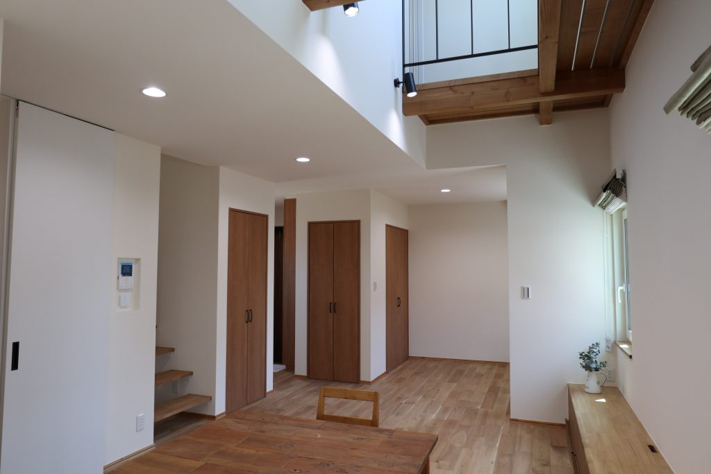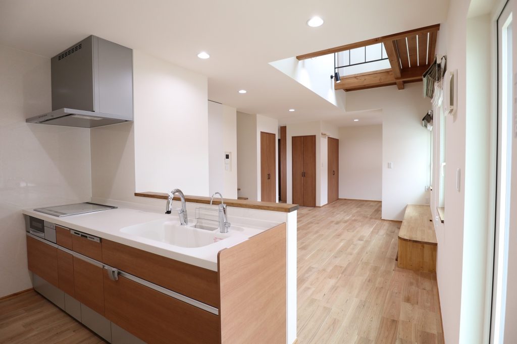 キッチンから見渡すリビングは、吹き抜けもあり大空間です。
