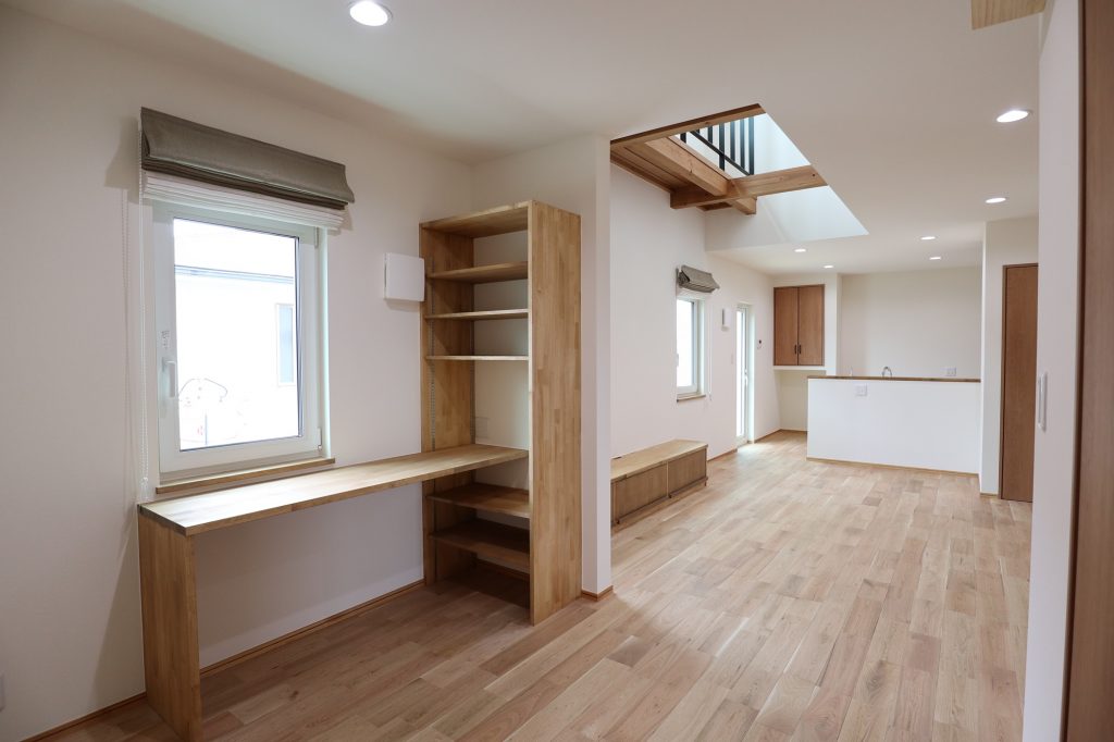 リビングには、デスクと本棚。キッズスペースも造りました。