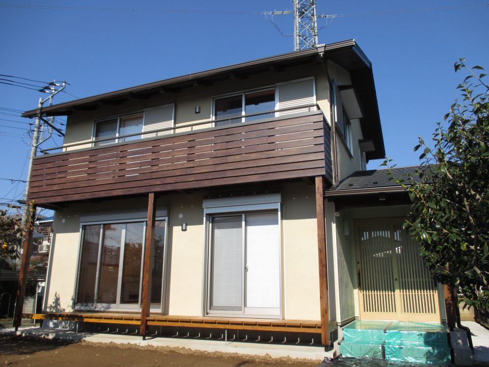 バルコニーの木部がおしゃれな外観。縁側はお庭を見ながら寛げる場になりました。