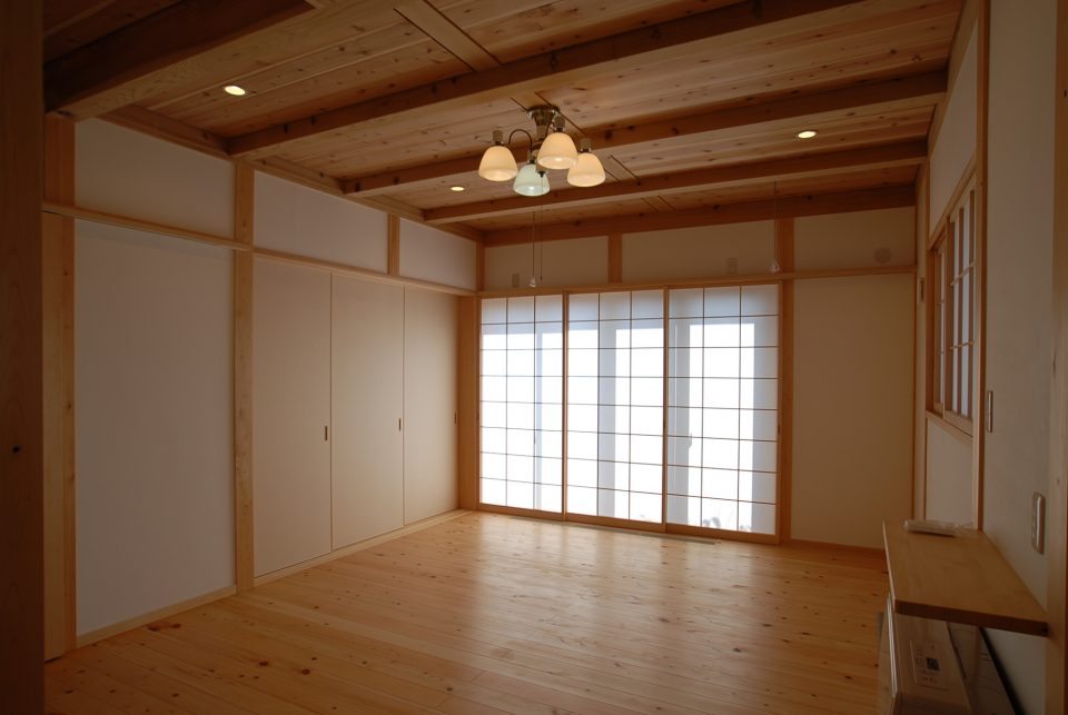 桧の無垢床、漆喰壁のリビング。障子から優しい陽が差し込みます。
