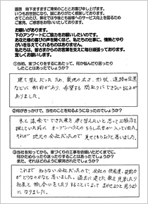 断熱性能が良く、パッシブソーラーの効果もあって、冬を暖かく過ごせます。施工後のメンテナンスにすぐ応じてくださることが安心と信頼につながり、貴社に建ててもらってよかったと思います。