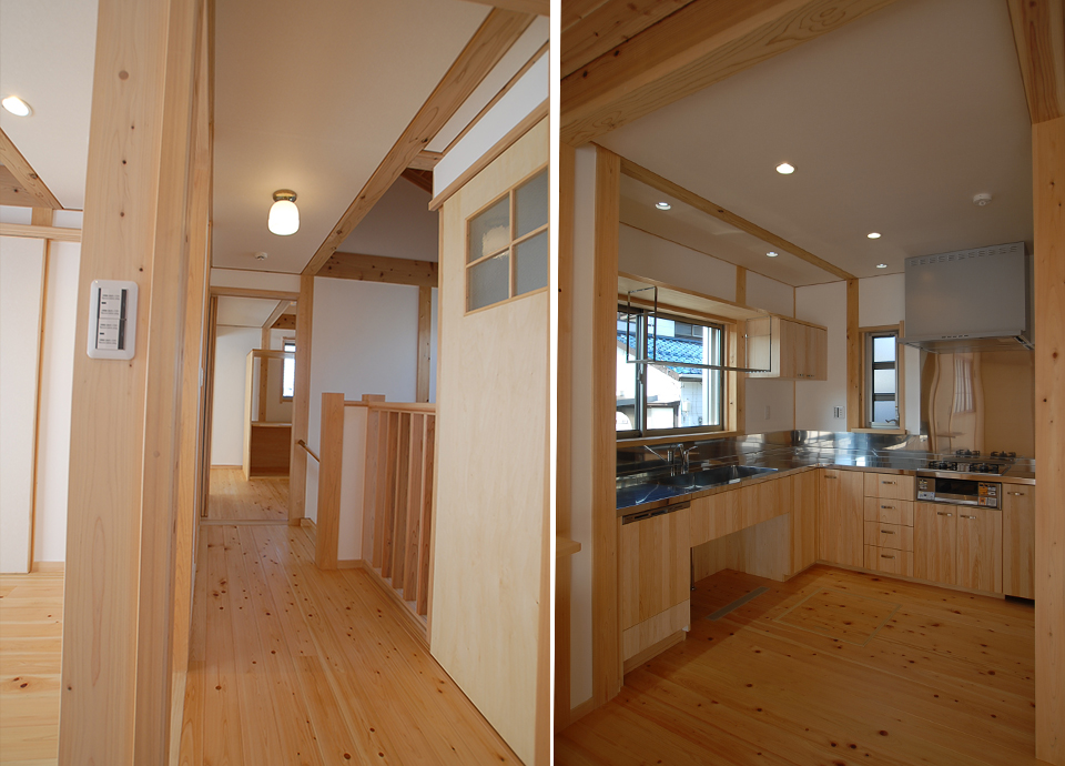 木をふんだんに使った2Fホール。 L型のキッチンはステンレスのワークトップ、桧で造作しました。