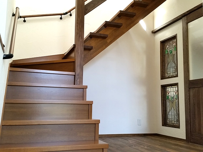 お施主様が作られたステンドグラスを壁にはめ込んで。
