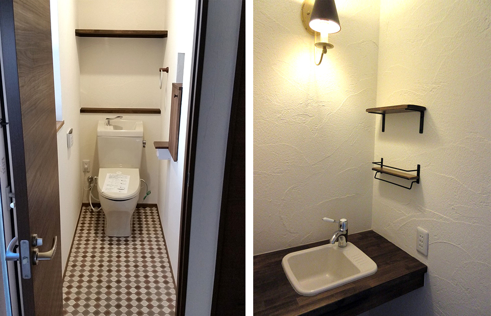 床の柄がアクセントのトイレ。 水栓と陶器のボウルがおしゃれな2Fの手洗いコーナー。