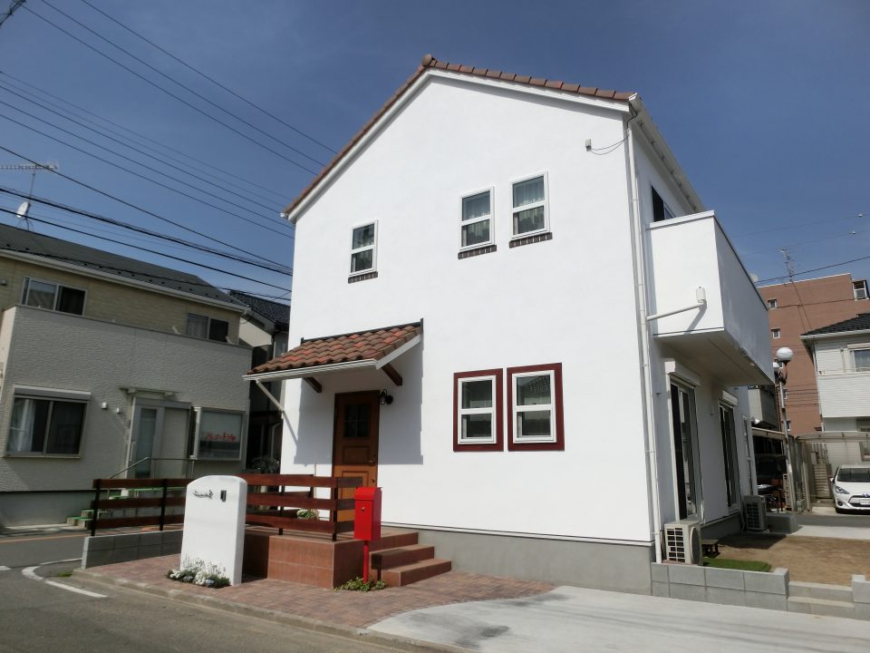 南欧風の可愛い外観の家。赤いポストが映えます。