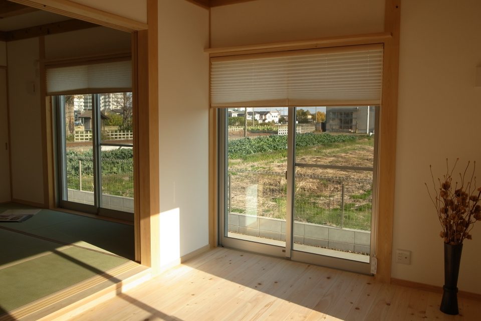 和紙調のプリーツカーテンは日差しを優しく遮ります。