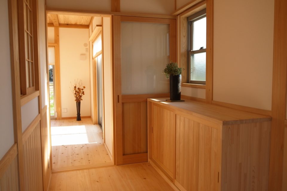 桧のゲタ箱、桧の腰壁、木の香りに包まれた玄関ホール。