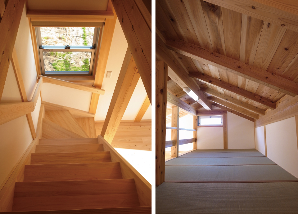 荷物の出し入れも楽なロフトに続く階段。ロフトの床にも畳を取り入れて。