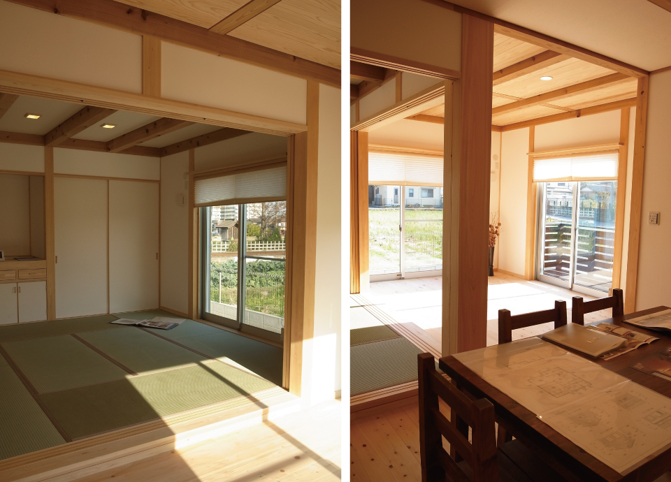 和紙を張り上げた建具など自然素材がいっぱい。 桧の無垢材、天井の板貼り、木をふんだんに使ったリビングダイニング。