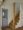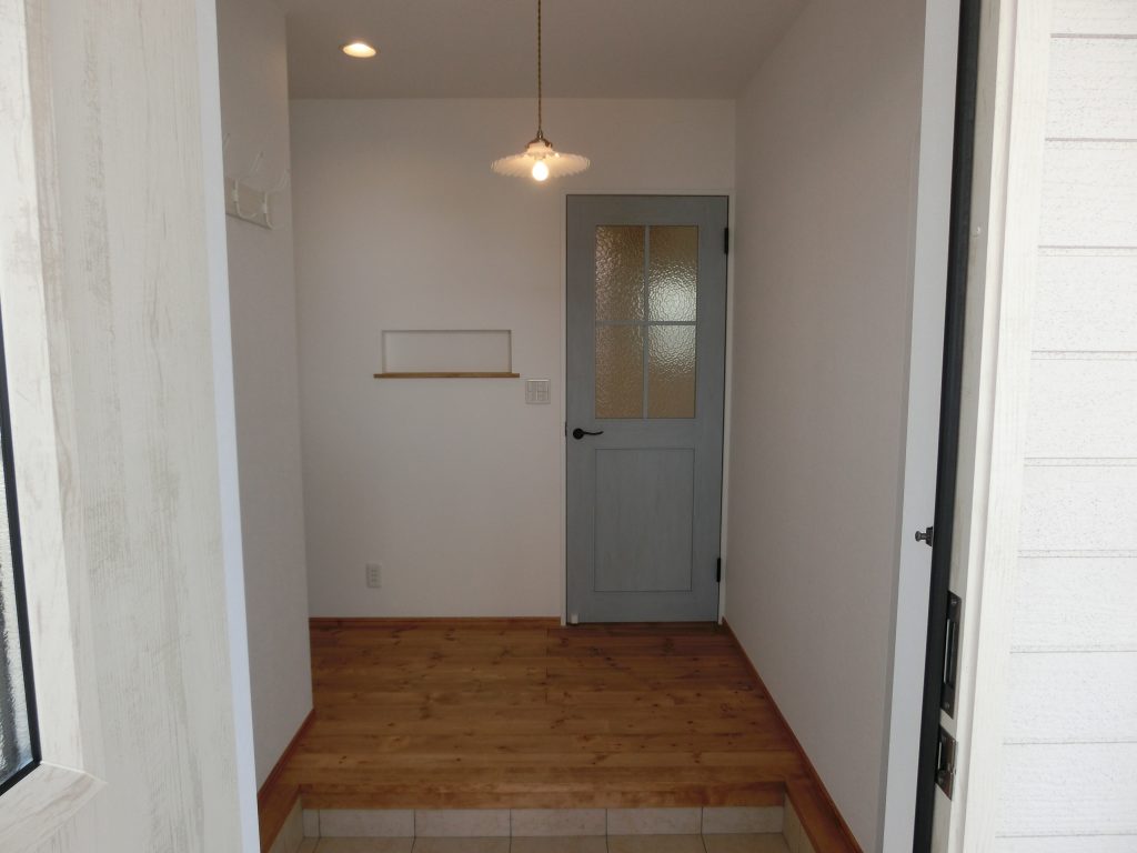 ブルーグレーのリビングドア、アンティークな照明が可愛い玄関ホール。