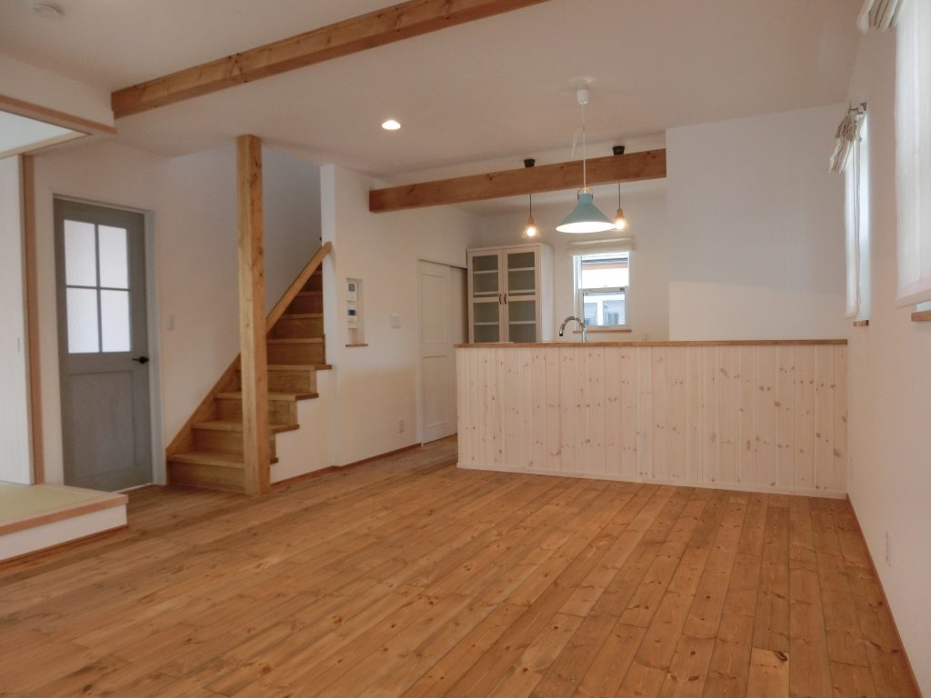 小上りの和室、梁と柱がアクセントのリビングダイニング。