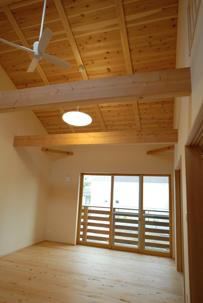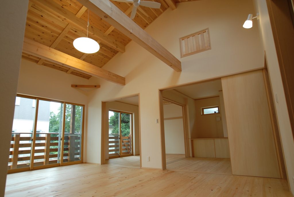 平屋ならではの吹き抜けの大空間は木の香りでいっぱい。