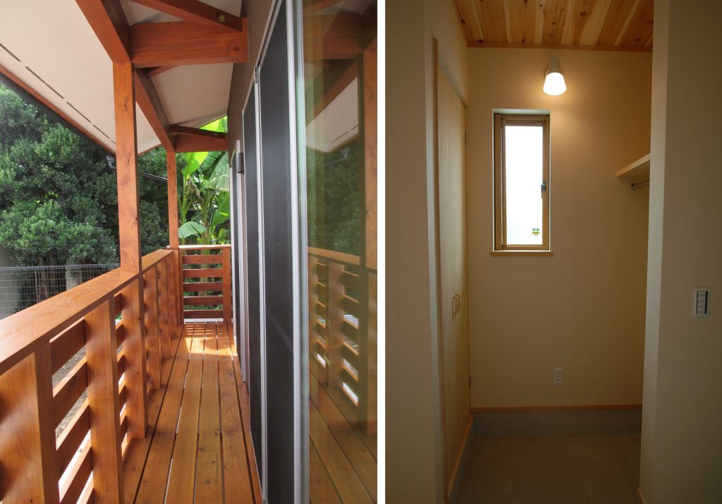 木をふんだんに使ったベランダは庭に降りられる扉も造作。玄関ホールの奥には便利なコート掛け。