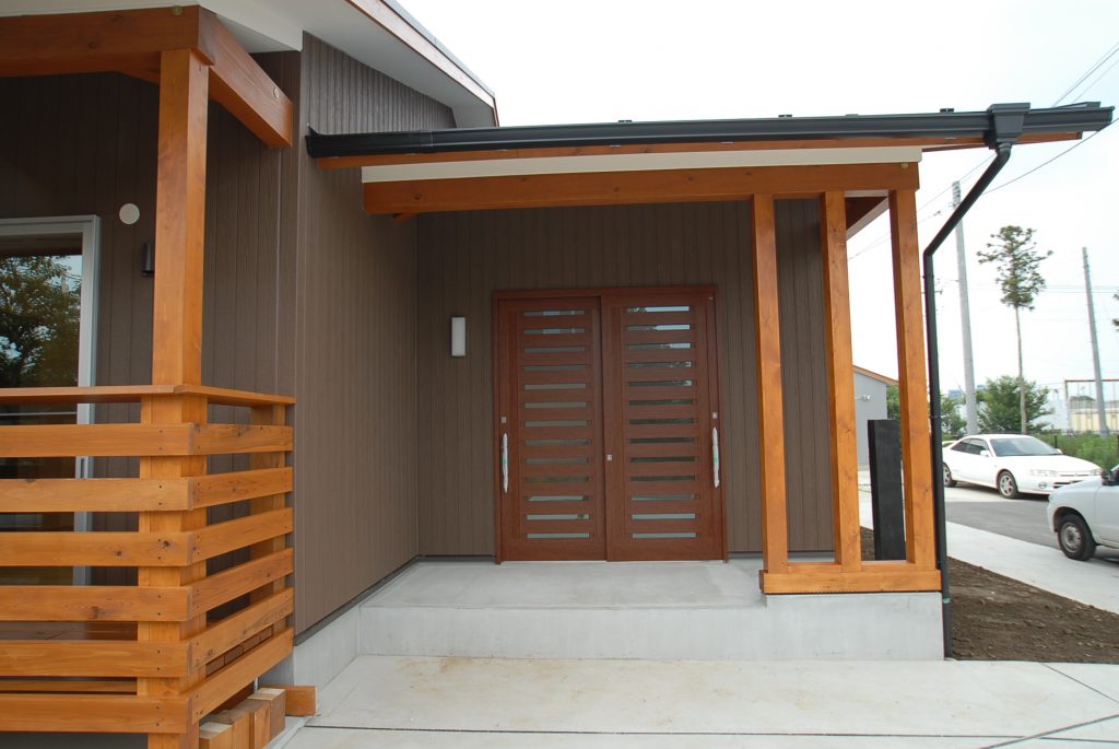 広い玄関ポーチには大きな引き戸の玄関ドア。